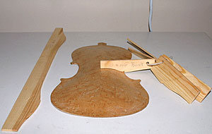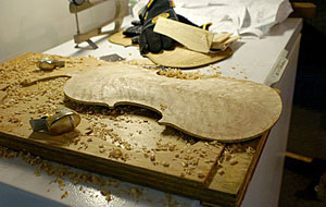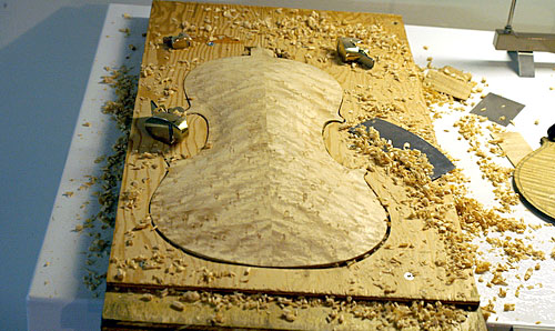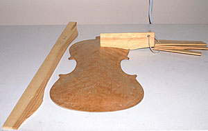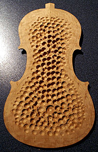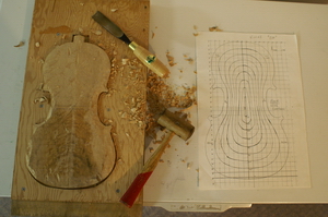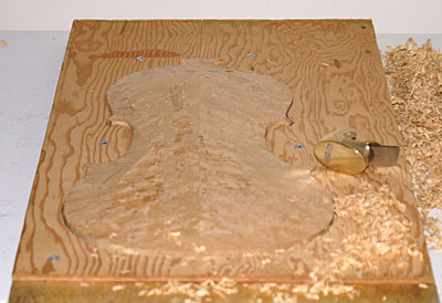 When getting very close to the proper thicknesses, I would hold the the back by the upper left corner between my thumb and fore finger, lightly tapping the middle of the plate with my knuckle. Listening to the tone of the plate, I would take more wood out to raise the tap tone to the desirable frequency of the back plate. The desired frequency should be 1 1/2 semitone higher than the belly. E for the belly and F# for the back.