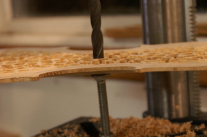 I set up a simple depth gauge for the drill press, set the stop at 5mm, and started drilling holes.
