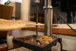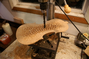 Setting up the drill press again, now to the precise depths in the different areas, I drilled more holes. The plate thicknesses where of the Stradivari design, taken from Simone F. Sacconi "The Secrets of Stradivari" book This has a thicker oval shaped area in the middle of the "C" bouts of 4.5mm, tapering to 3.5mm towards the upper and lower bouts and edges of the "C" bout. A 2.5mm thickness in the upper area of the upper bout as seen in the photo above, and a 2.6mm thickness in the lower area of the lower bout.