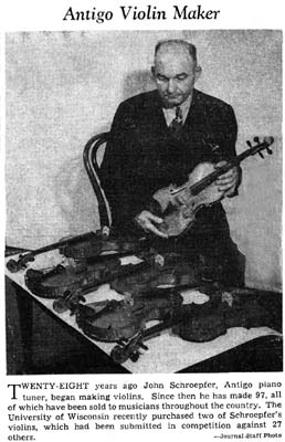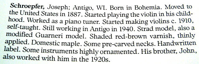 This is my favourite violin. I purchased it from Ed Schroepfer in 1990. It was hand made in 1932 by John Schroepfer of Antigo, Wisconsin.
